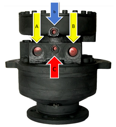 This final drive configuration is a little different. At the top is the brake line b, with a single case drain port C located between the A and B lines