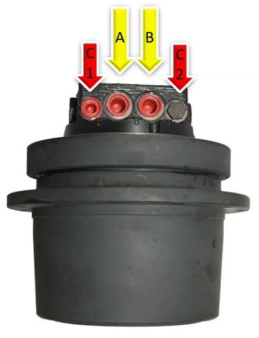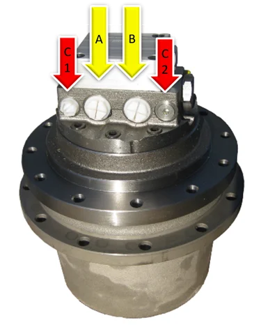 These are the largest ports and will always be present in matching pairs. The A and B ports are the forward and reverse input ports. They’re usually the largest ports you’ll see on a final drive, and you can find them in the middle of the hydraulic manifold. They handle the high-pressure hydraulic fluid that powers the motor. If you mix up which one is the flow and which one is the return, you’ll notice your final drive motor running in reverse of what it is supposed to.